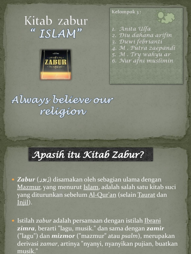 Di antara kitab-kitab suci yang wajib kita percayai salah satunya adalah Zabur yang diturunkan kepada Nabi Daud AS. Kitab Zabur itu agama apa. Sedangkan Kitab Zabur hanya digunakan untuk panduan berdoa dan memuji Tuhan yang Maha Esa.